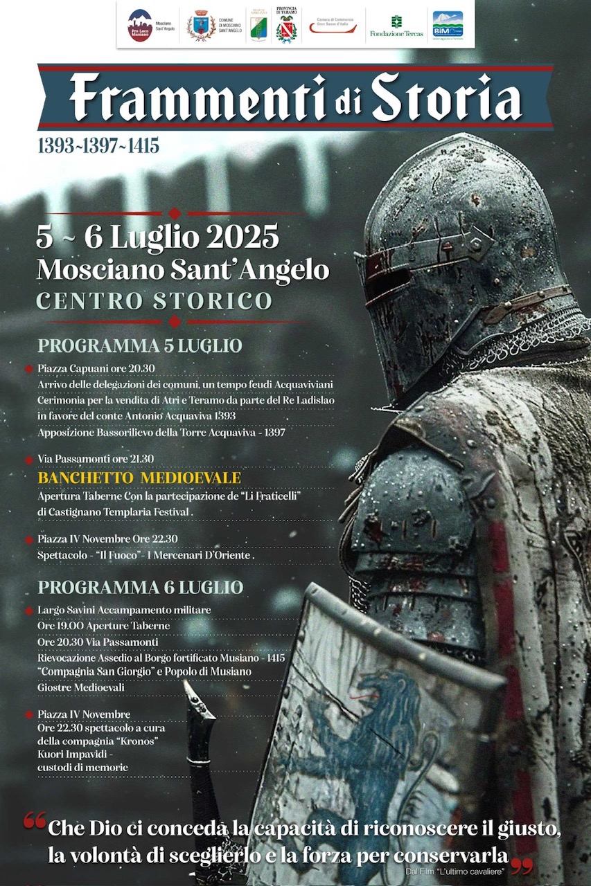 Teramo 1 luglio 2025. La manifestazione andrà a rievocare eventi storici intercorsi tra il 1393 e il 1415, a partire dalla vendita da parte di Re Ladislao di Durazzo delle città di Atri e Teramo al conte Antonio Acquaviva per 35.000 ducati d’oro, fino alla capitolazione del castello di Mosciano Sant’Angelo sotto l’assedio del condottiero Conte da Carrara per conto della Regina Giovanna II di Napoli.