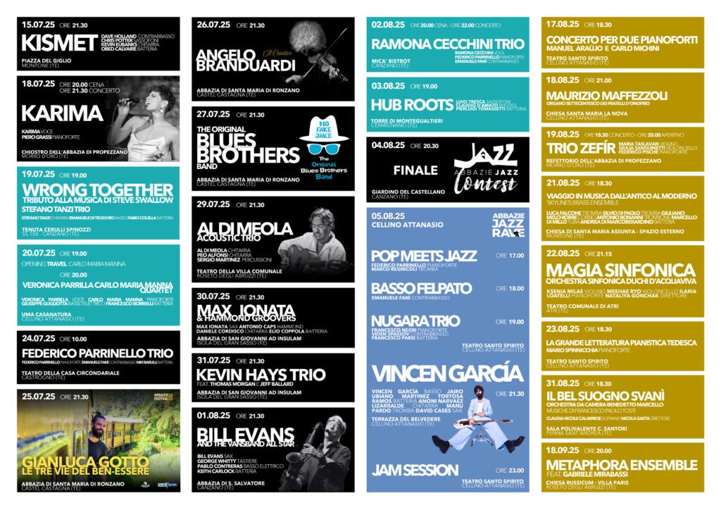 Novità di quest’anno è il format Abbazie Jazz&Friends, che unisce musica, natura e eccellenze locali, con appuntamenti ospitati nelle cantine Tenuta Cerulli Spinozzi, Uma Casanatura, il MiCa Bistrot di Canzano e la Torre Triangolare di Montegualtieri. Il primo grande giro di boa arriva con tre appuntamenti imperdibili: 1° agosto: Bill Evans & The Vansband All Stars presso l’Abbazia di S. Salvatore a Canzano; il 4 agosto ci sarà la finale di Abbazie Jazz Contest, vetrina per le band emergenti; il 5 agosto è in programma il grande evento Abbazie Jazz Rave nel borgo di Cellino Attanasio, dalle 16 alle 2, con il concerto di Vincen García, affermato bassista della scena jazz-funk mondiale, e molte altre performance. Non manca l’impegno sociale: anche quest’anno si rinnovano i concerti nella Casa Circondariale di Castrogno, con attività dedicate ai detenuti, a conferma della vocazione inclusiva del festival.