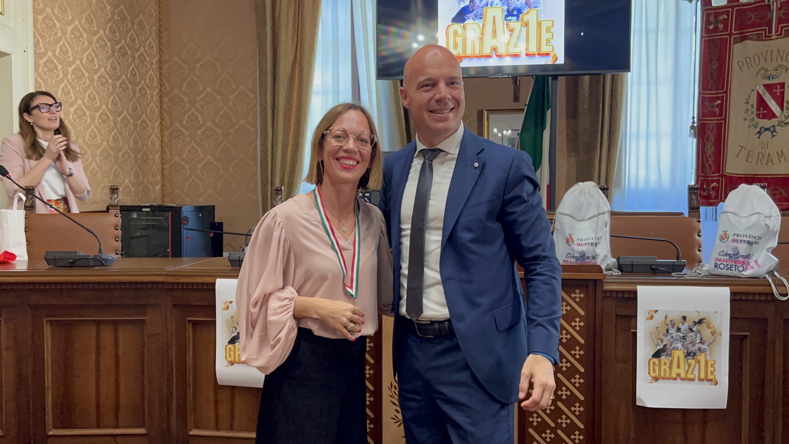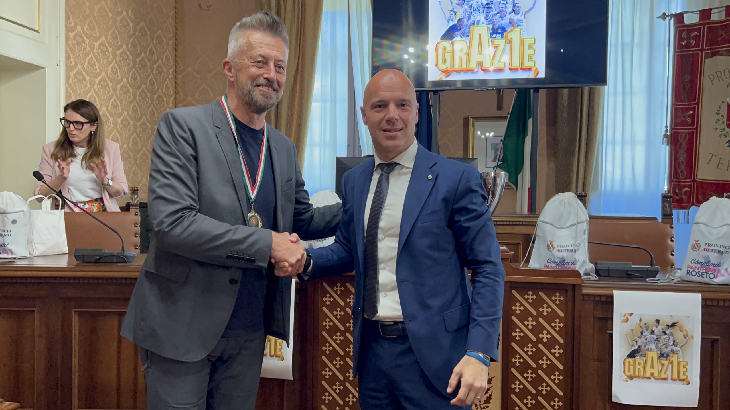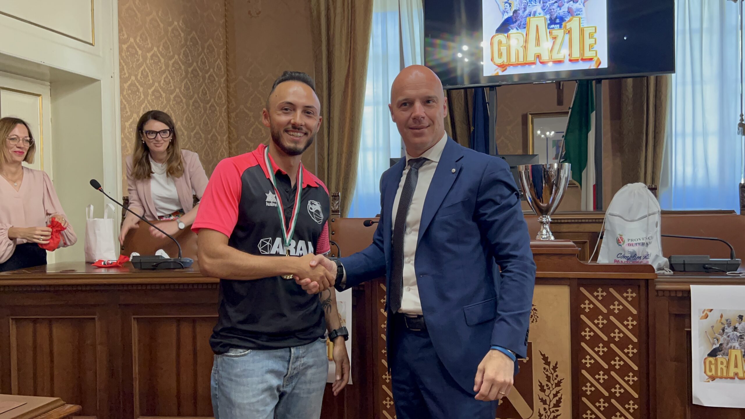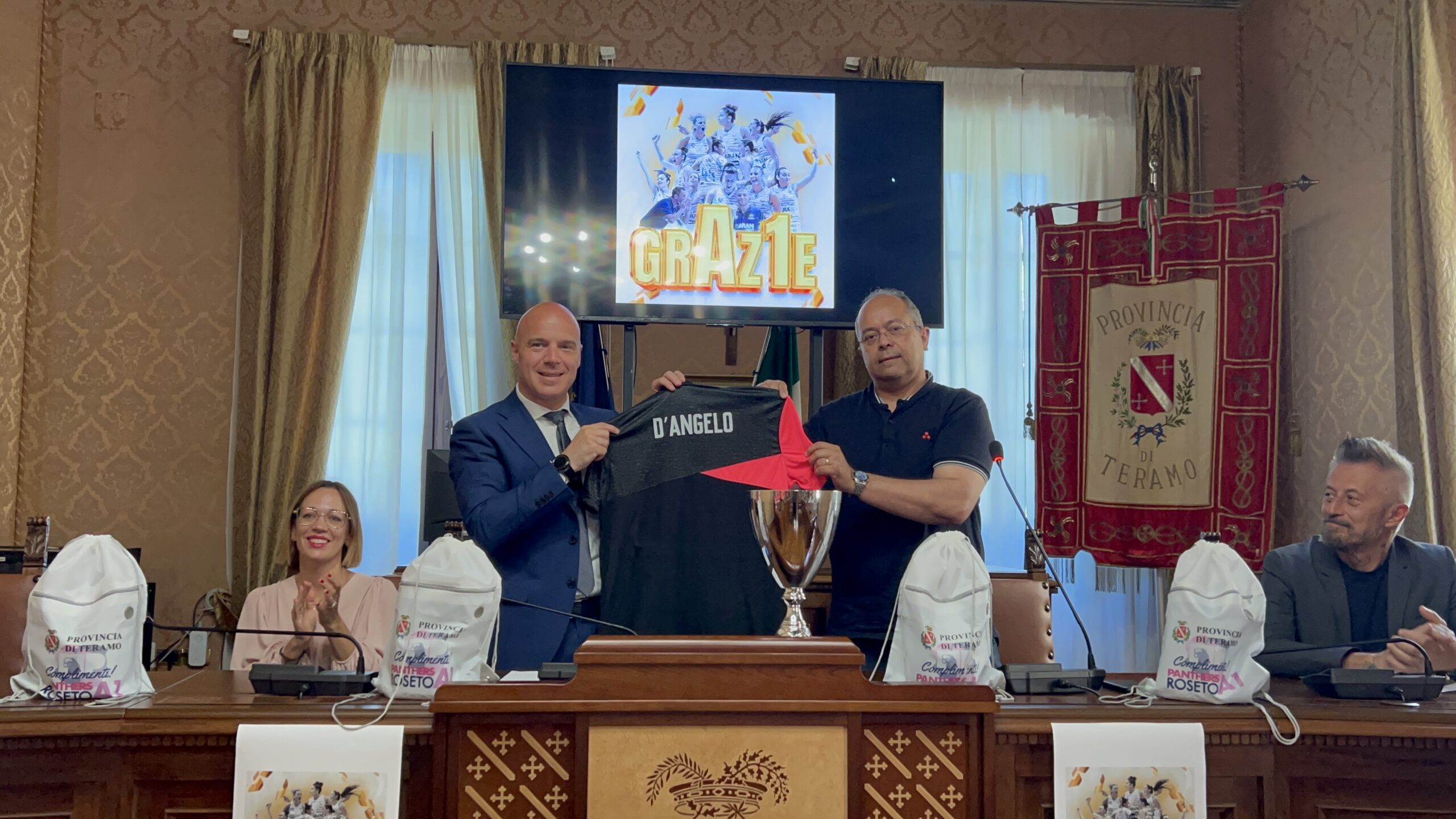 Teramo 3 giugno 2025. Le giocatrici della squadra promossa in serie A1 nazionale di basket femminile, compiendo un’impresa da tutti considerata “storica”, le Panthers di Roseto degli Abruzzi, questa mattina, sono state accolte in Provincia dal presidente Camillo D’Angelo e dal consigliere delegato allo sport, Flavio Bartolini per una piccola cerimonia che ha voluto rendere omaggio all’impresa e a chi l’ha compiuta.