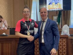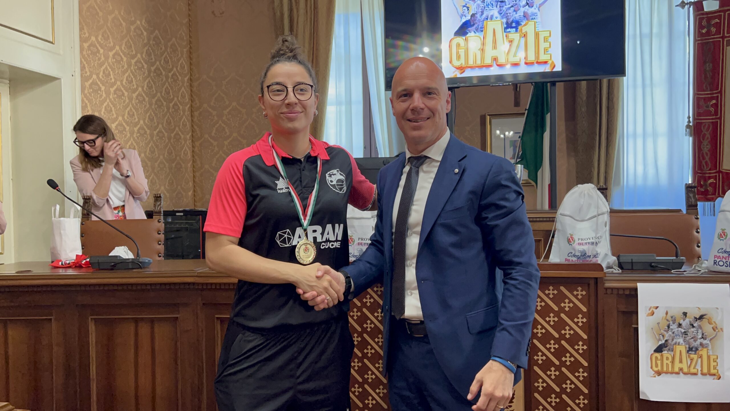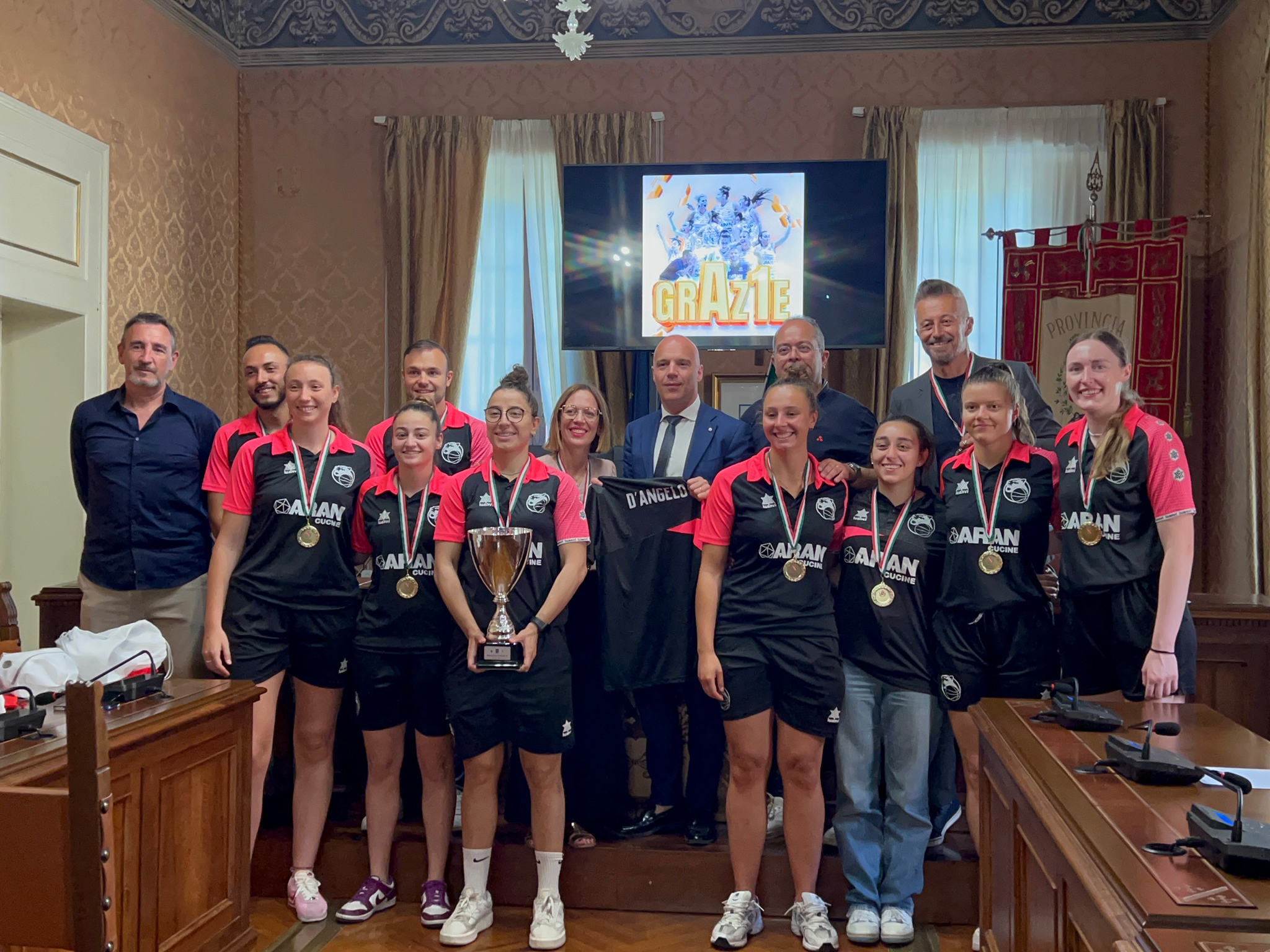 Alla squadra con la capitana Giulia Sorrentino e le giocatrici accompagnate dal team manager, Giorgio Pomponi, dal presidente della squadra, Gianpaolo Pigliacampo, dall’allenatore Simone Righi e da Erika Rastelli, ARAN Cucine e main sponsor, sono state donate delle medaglie personalizzate e una targa per segnare in maniera ufficiale e simbolica il valore di questo successo agonistico.