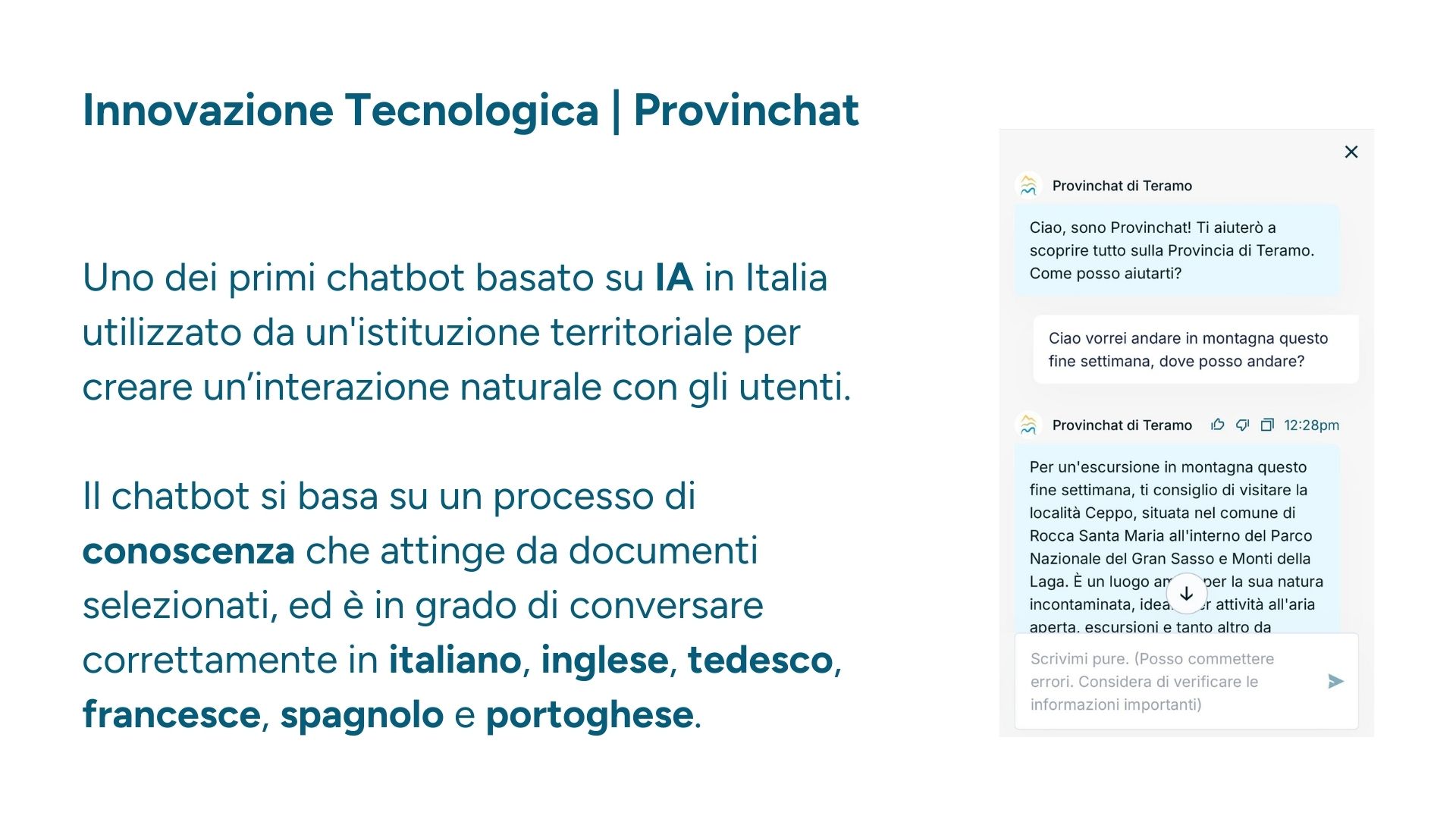 Il chatbot si allena con le informazioni che riceve, quindi, maggiori saranno le interazioni fra Enti locali, operatori e turisti stessi, migliore sarà l’esattezza delle risposte del chatbot.