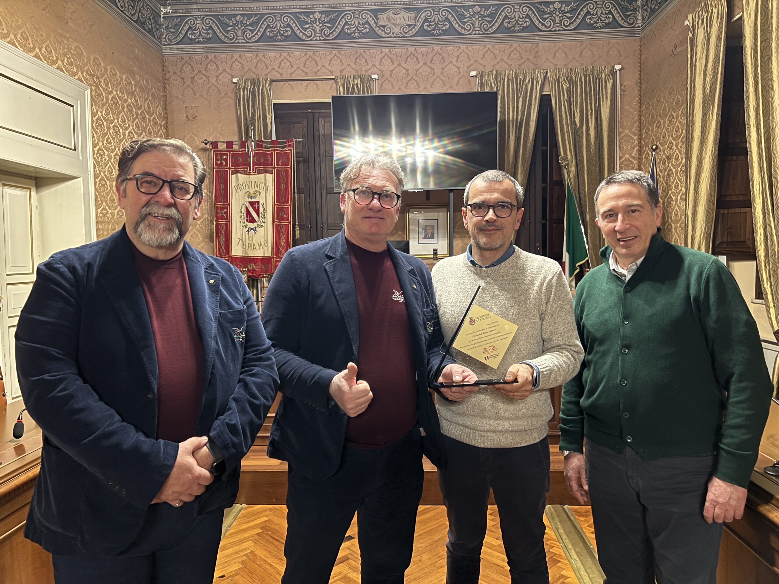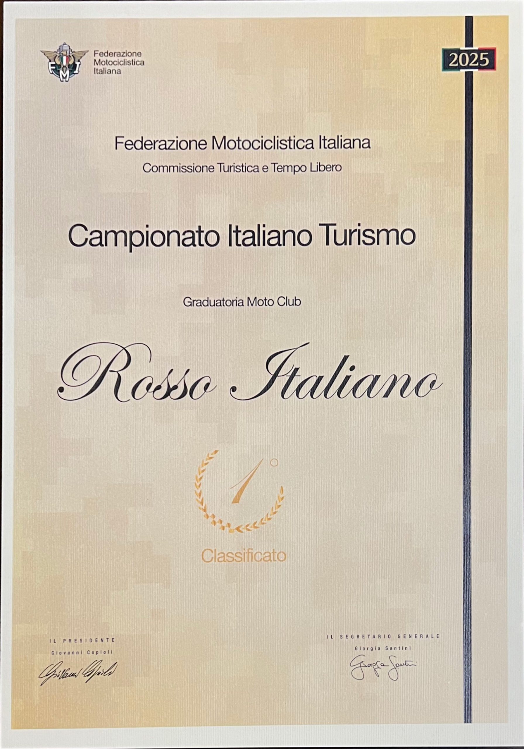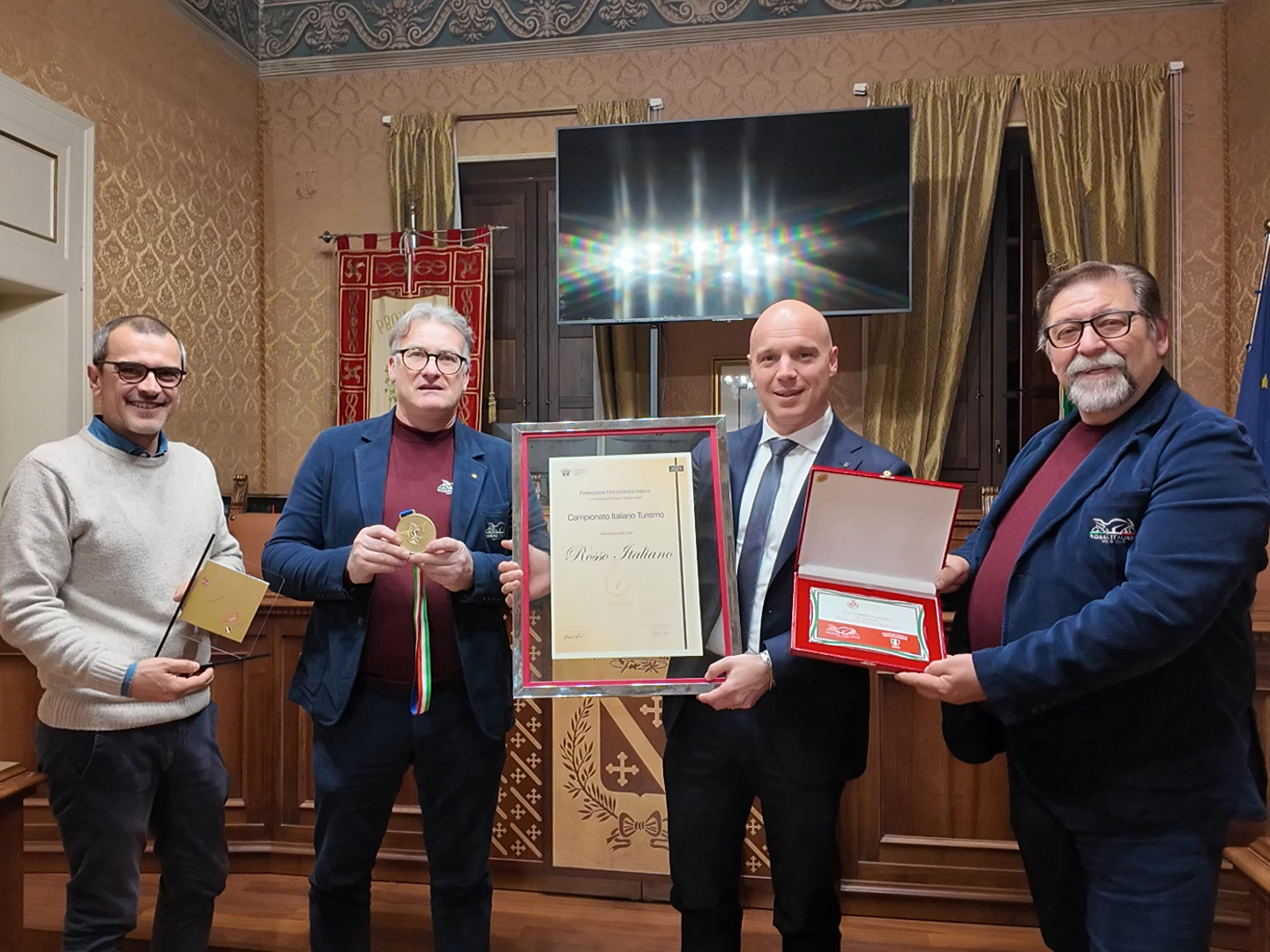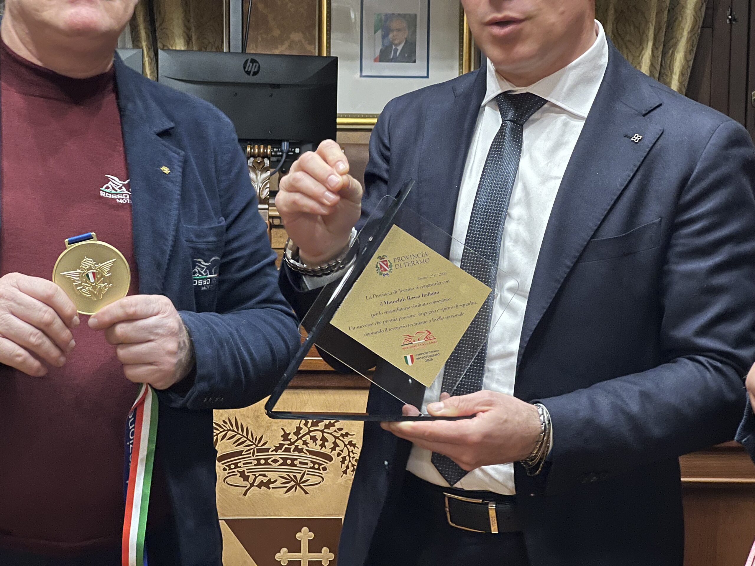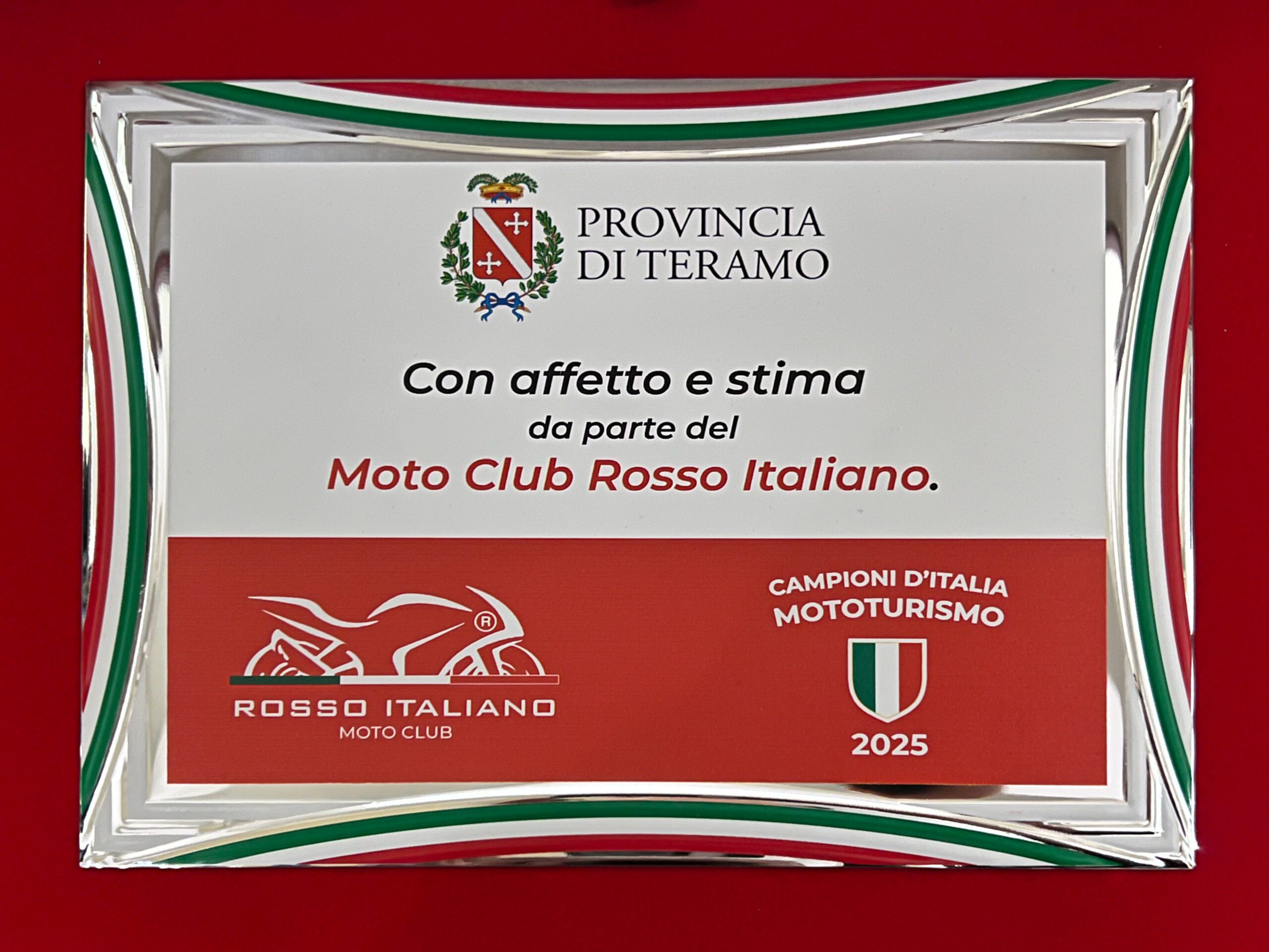 Teramo, 2 febbraio 2026. Una targa di riconoscimento da parte della Provincia di Teramo al MotoClub Rosso Italiano, diventato campione d'Italia di moto turismo.