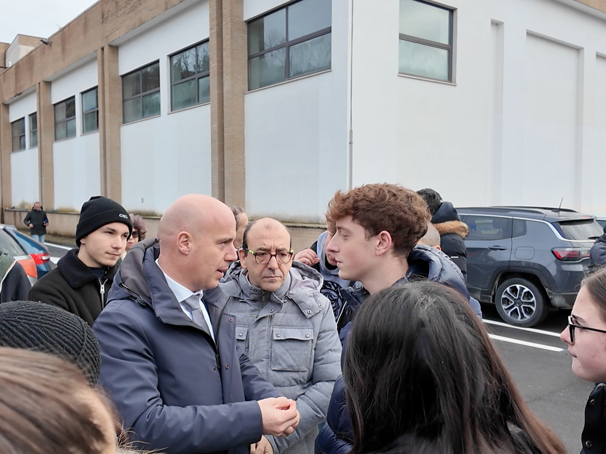 La contestazione di due quinte del Liceo Scientifico. Insieme alle autorità, questa mattina, erano presenti gli studenti di due classi quinte dello Scientifico che contestano la loro collocazione all’interno del nuovo modulo e chiedono di tornare al contiguo “Forti” dove sono presenti le altre quinte.