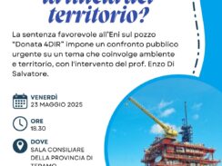 Teramo, 19 maggio 2025 – La recente sentenza del Consiglio di Stato, che ha respinto il ricorso dei Comuni di Martinsicuro, Alba Adriatica, Pineto e della Provincia di Teramo contro la concessione ENI per il nuovo pozzo di gas “Donata 4DIR” al largo della foce del fiume Tronto, ha acceso un dibattito sul futuro del nostro territorio e della nostra costa. Per fare chiarezza sulle implicazioni ambientali e giuridiche di questa decisione, la Conferenza Provinciale per l’Ambiente di Teramo e l’associazione Marche a Rifiuti Zero ETS promuovono un incontro pubblico in programma venerdì 23 maggio 2025 alle ore 18:30, presso la Sala Consiliare della Provincia di Teramo (Via Giannina Milli, 2).
